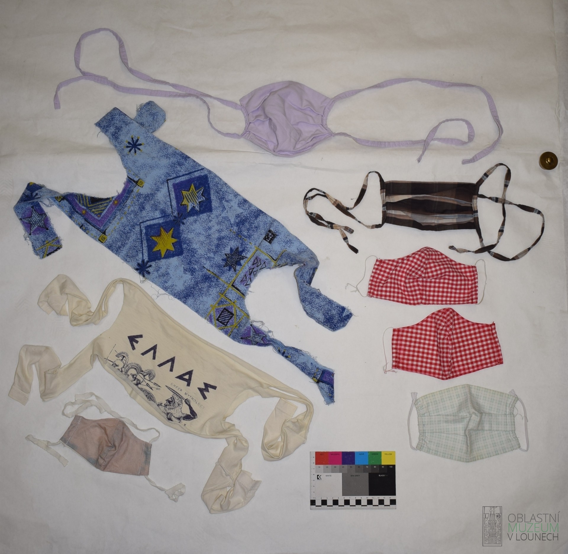 Sháníme proto např. klobouky vyrobené v našem městě nebo spodní prádlo, které v Lounech pod značkou Triola šil národní podnik Panar. Další okruh předmětů by se mohl týkat uniforem či stejnokrojů a dresů, které lounské kapely, sbory, sportovní kluby po určité době vyřazují a pořizují si nové. Zajímavým oděvním doplňkem nedávné doby pandemie koronaviru byly roušky, zprvu podomácku vyráběné.