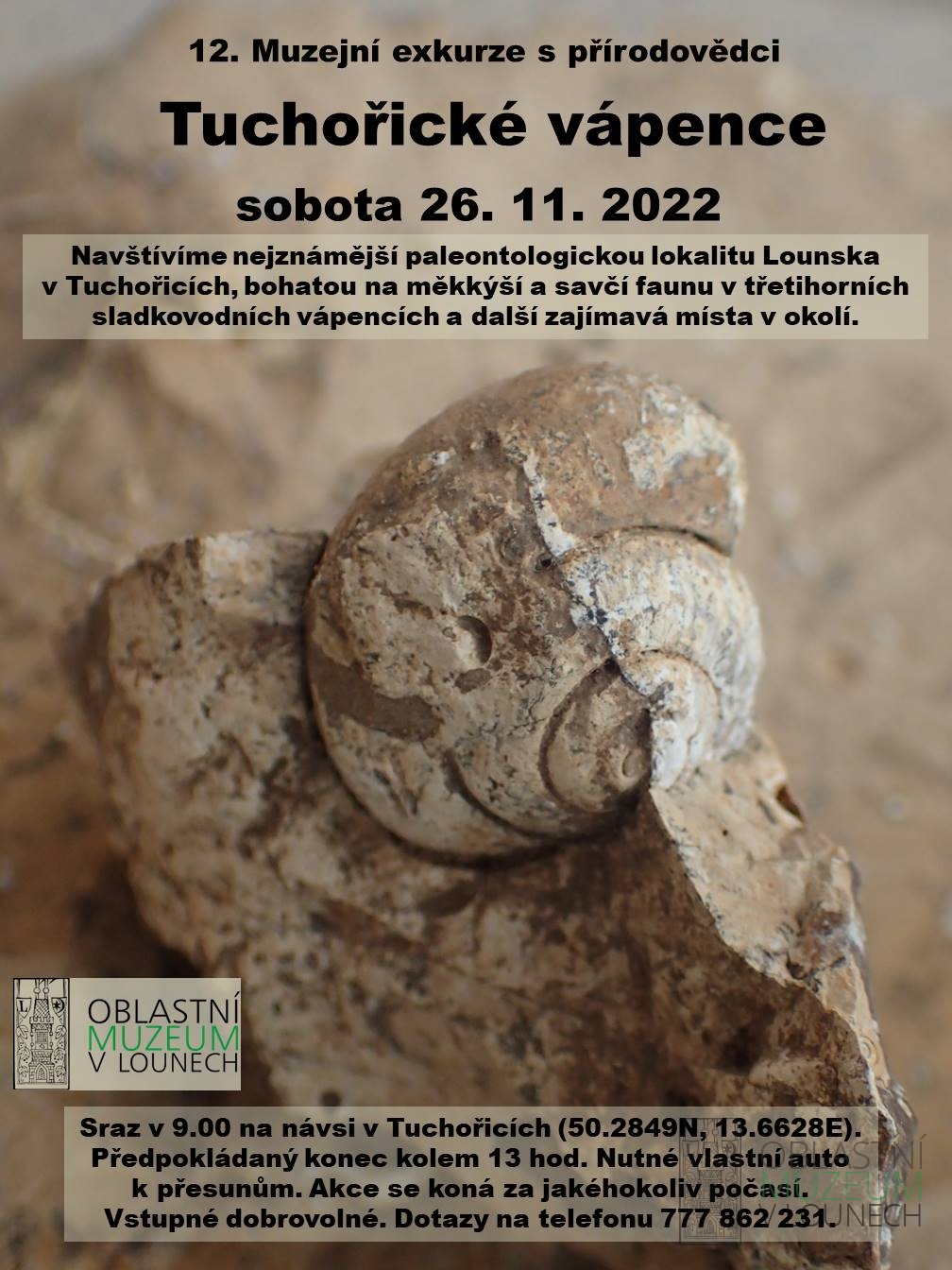 Tentokrát spolu s přírodovědci lounského muzea navštívíte nejznámější paleontologickou lokalitu Lounska v Tuchořicích, bohatou na měkkýší a savčí faunu v třetihorních sladkovodních vápencích. Dále nás čeká památný dub v Tuchořicích, menhiry v okolí či údolí Hasiny u Lipence. Sraz 26. 11. 2022 v 9.00 na návsi v Tuchořicích (50.2849N, 13.6628E). Předpokládaný konec kolem 13 hod. Nutné vlastní auto k přesunům. Akce se koná za jakéhokoliv počasí. Vstupné dobrovolné. Dotazy na telefonu 777 862 231.