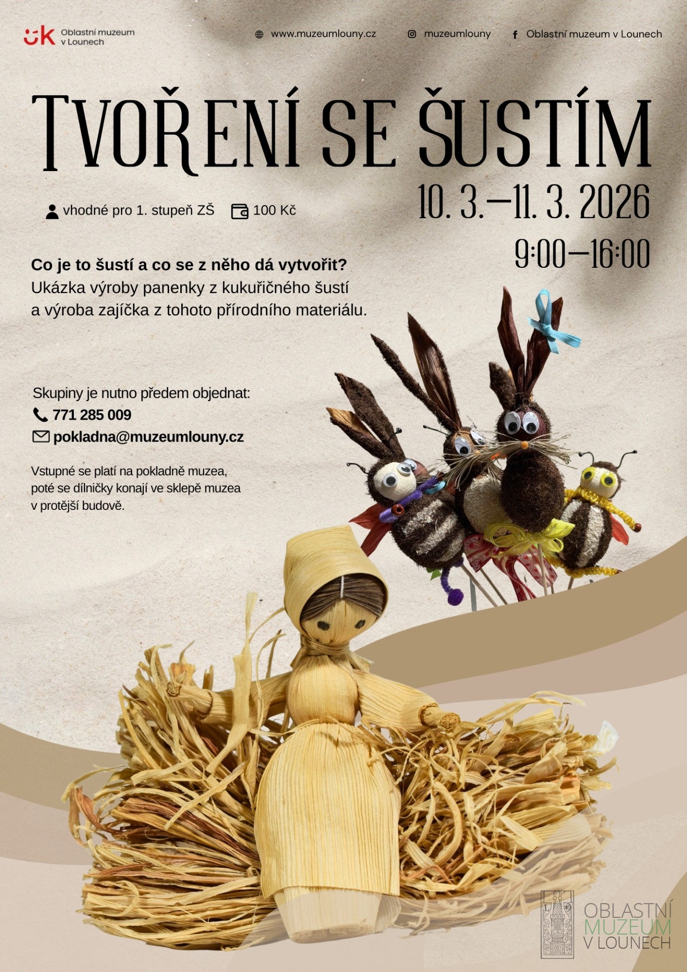 Co je to šustí a co se z něho dá vytvořit? Ukázka výroby panenky z kukuřičného šustí a výroba zajíčka z tohoto přírodního materiálu. Vstupné se platí na pokladně muzea, poté se dílničky konají ve sklepě muzea v protější budově.