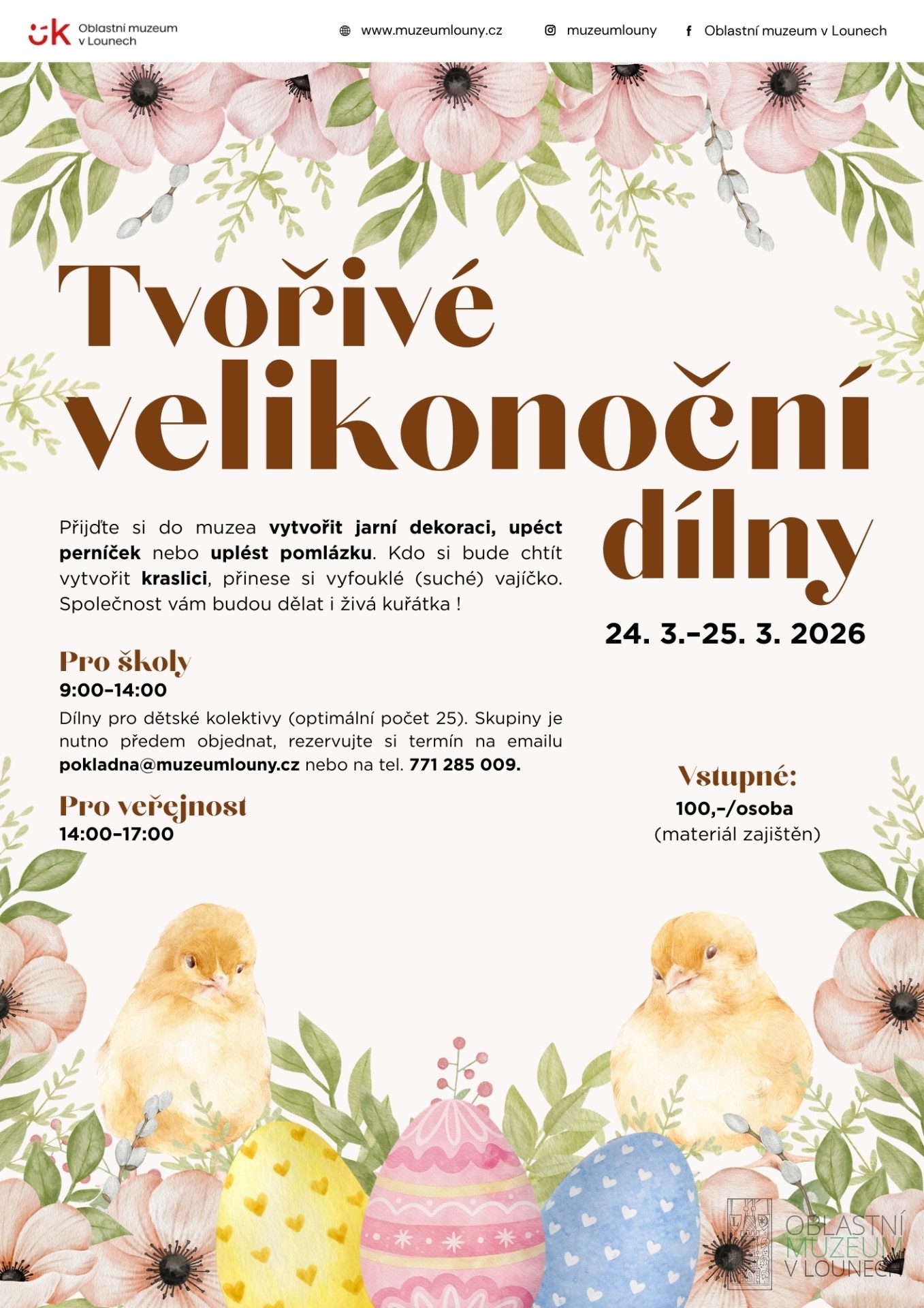 Přijďte si do muzea vytvořit jarní dekoraci, upéct perníček nebo uplést pomlázku. Kdo si bude chtít vytvořit kraslici, přinese si vyfouklé (suché) vajíčko. Společnost vám budou dělat i živá kuřátka !
