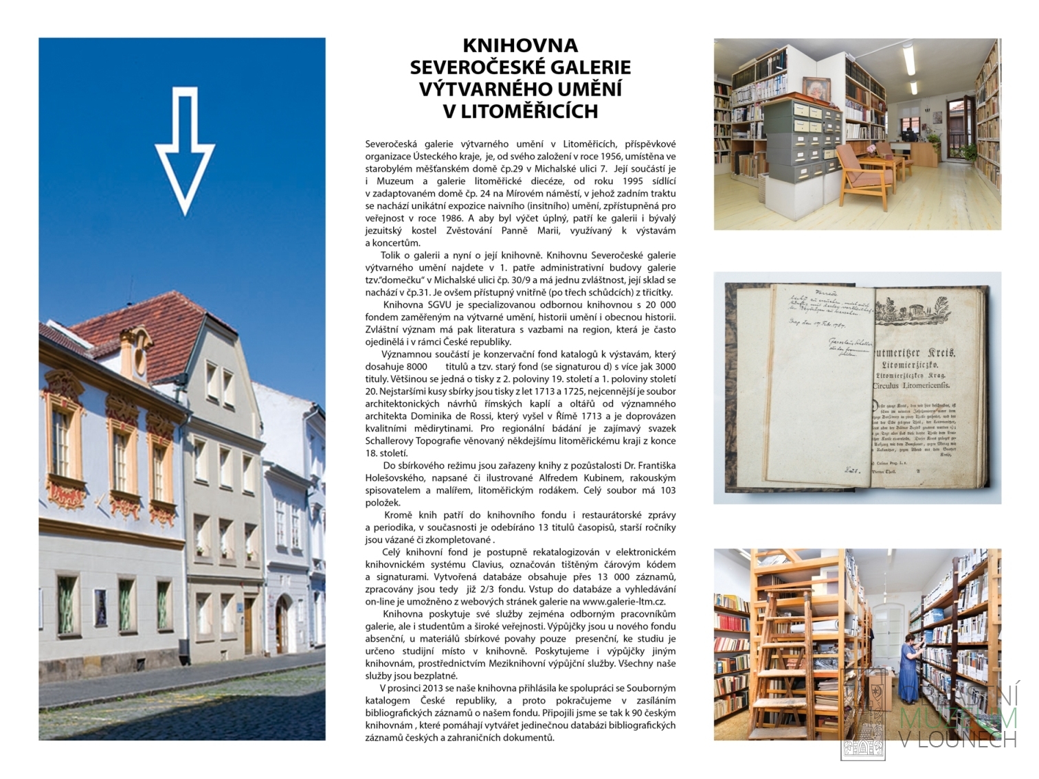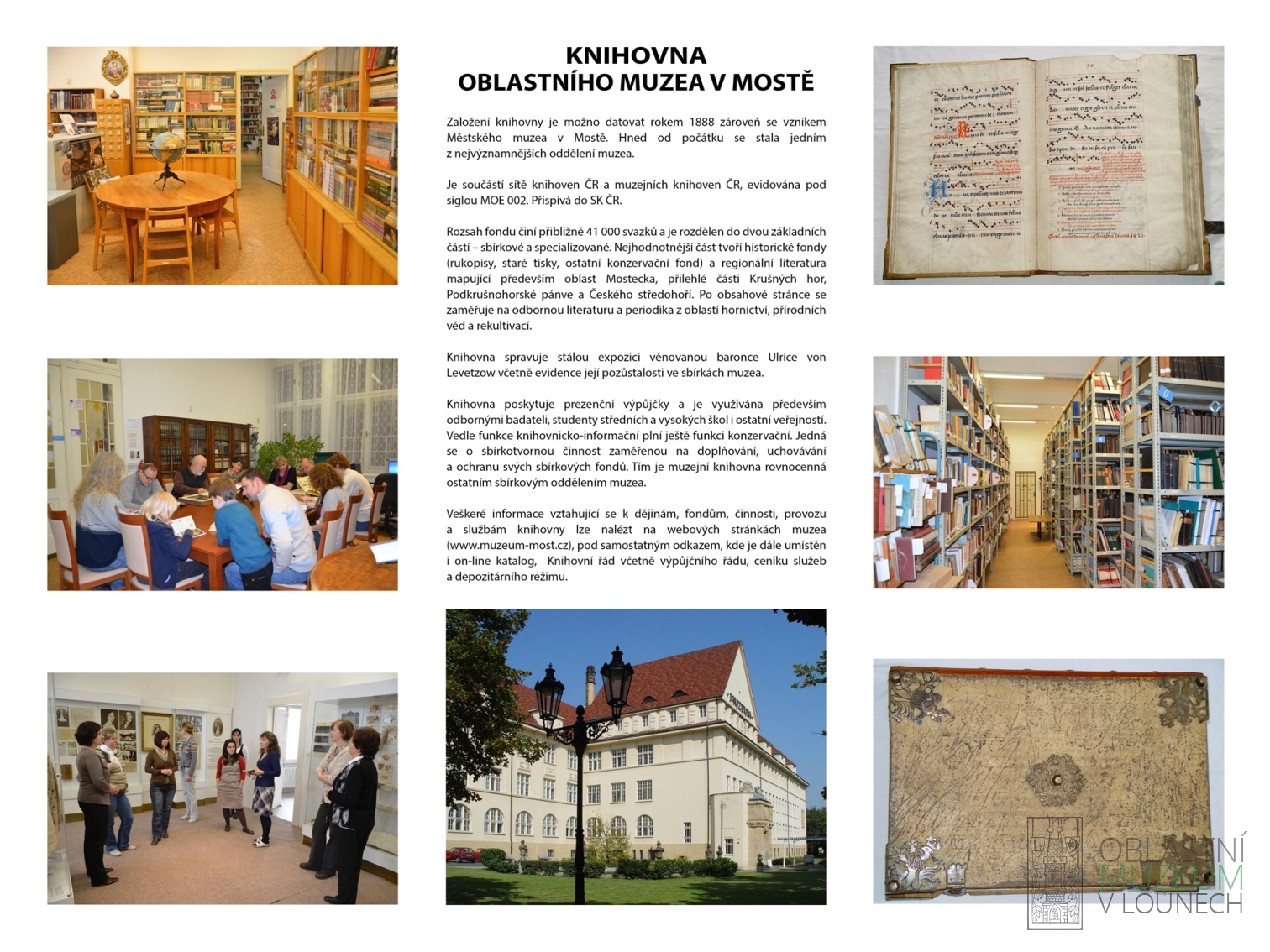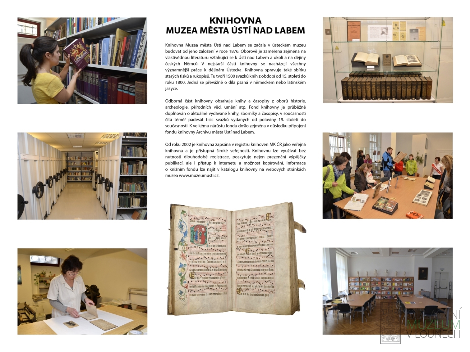 Ve stručném přehledu představujeme osm největších knihoven muzeí a galerií Ústeckého kraje, které aktivně spolupracují v rámci Komise muzejních knihoven a jsou členy Asociace muzeí a galerií ČR a Svazu knihovníků a informačních pracovníků ČR.