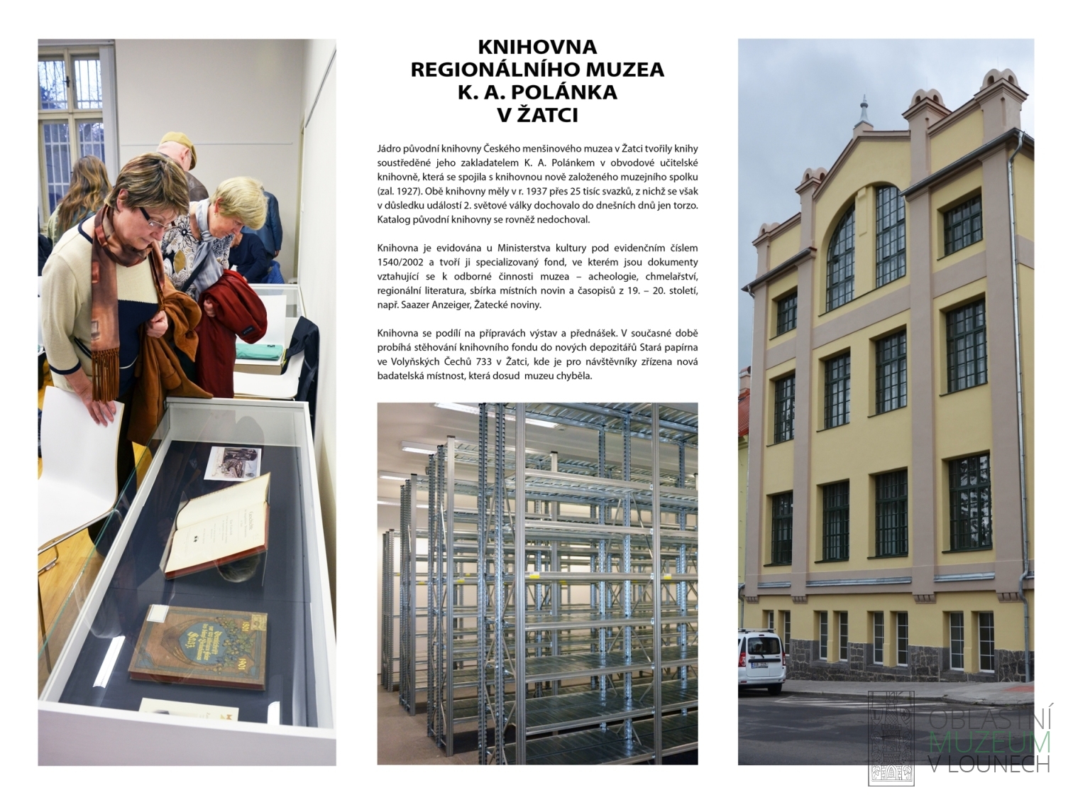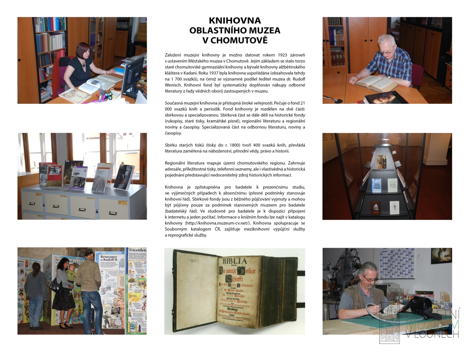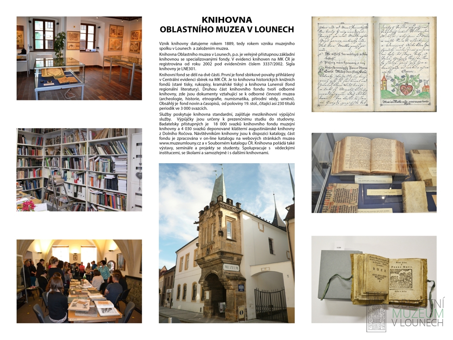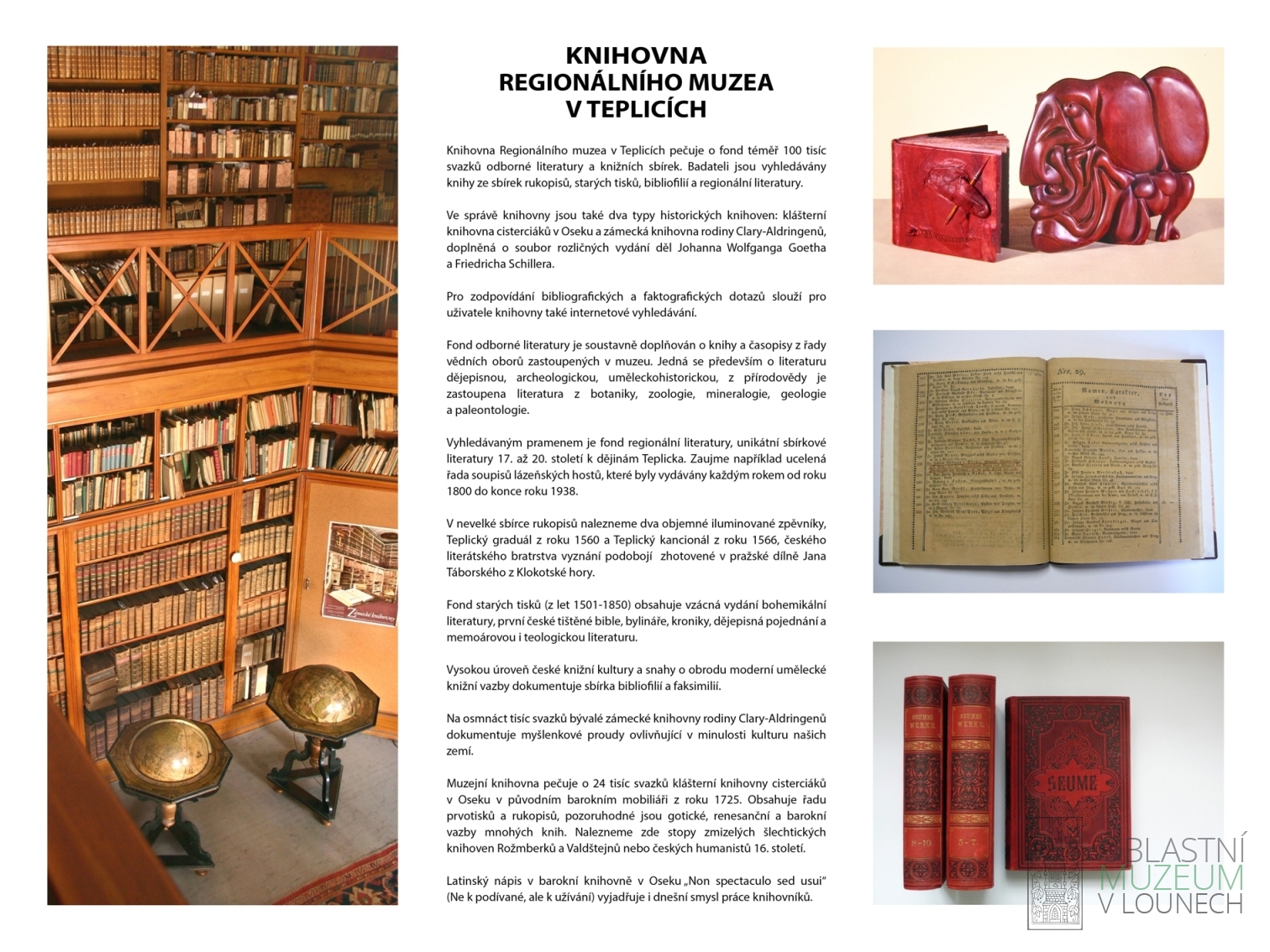 Ve stručném přehledu představujeme osm největších knihoven muzeí a galerií Ústeckého kraje, které aktivně spolupracují v rámci Komise muzejních knihoven a jsou členy Asociace muzeí a galerií ČR a Svazu knihovníků a informačních pracovníků ČR.