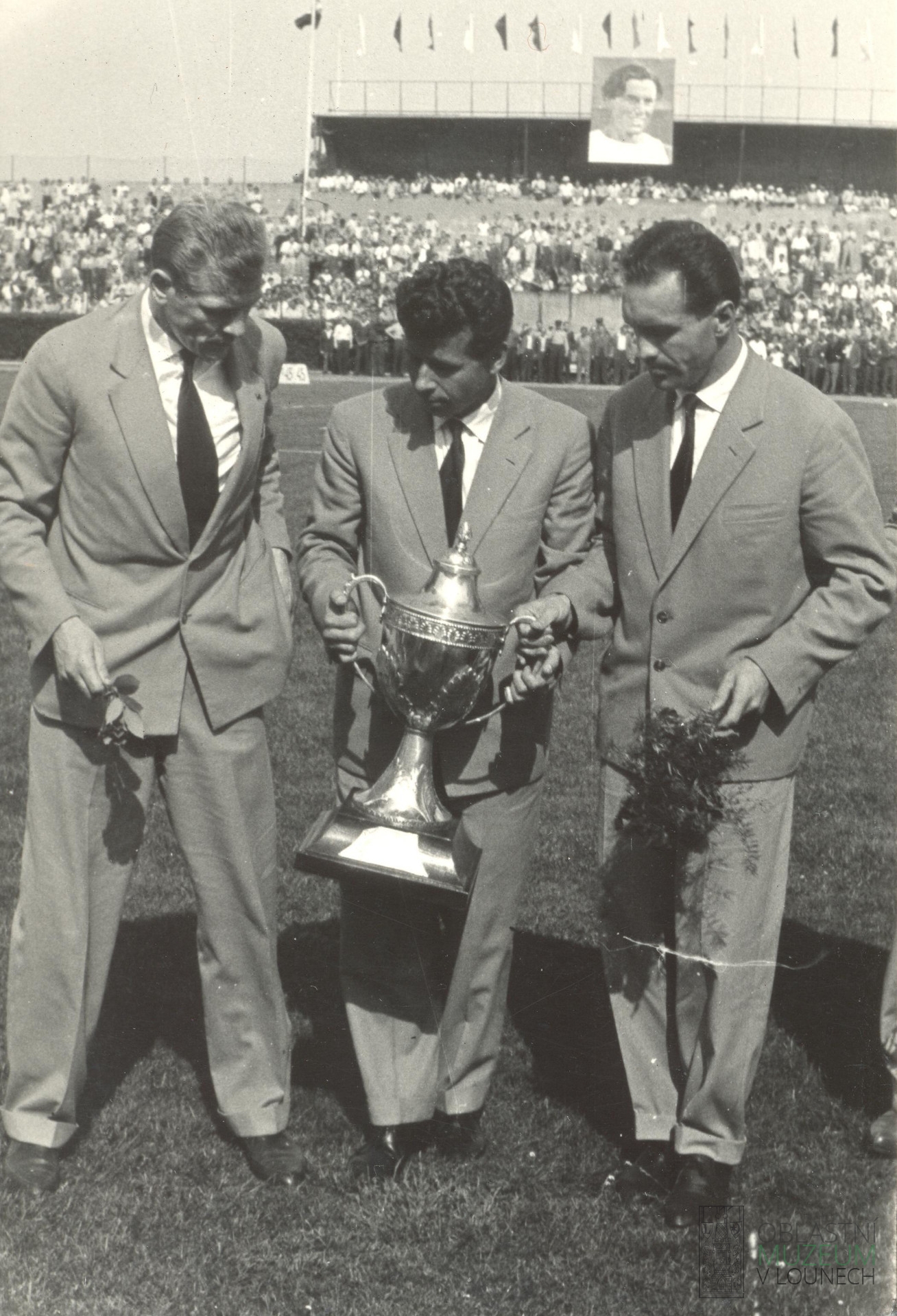 Na fotografii jsou Ladislav Novák, Josef Masopust a Svatopluk Pluskal se stříbrným pohárem z mistrovství světa v Chile 1962.