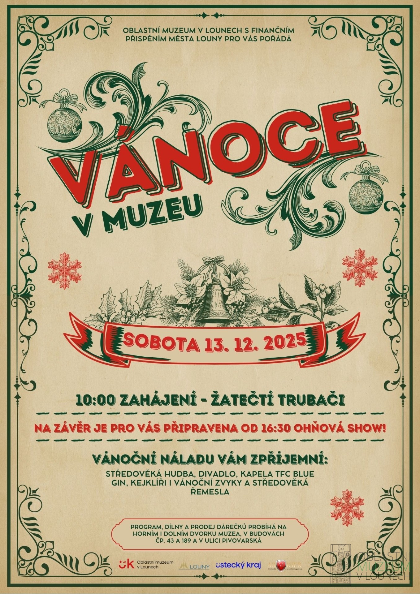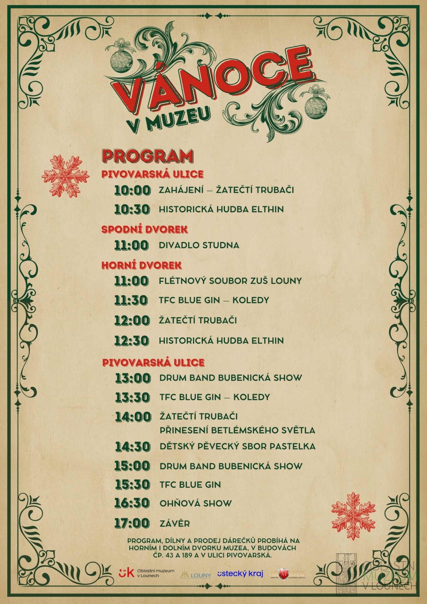 V 10:00 zahájí trhy Žatečtí trubači. Program, dílny a prodej dárečků probíhá na horním i dolním dvorku muzea, v budovách čp. 43 a 189 a v ulici Pivovarská. Vánoční náladu Vám zpříjemní: středověká hudba, divadlo, kapela TFC Blue gin, kejklíři i vánoční zvyky, a středověká řemesla. Na závěr je pro Vás připravena od 16:30 ohňová show!