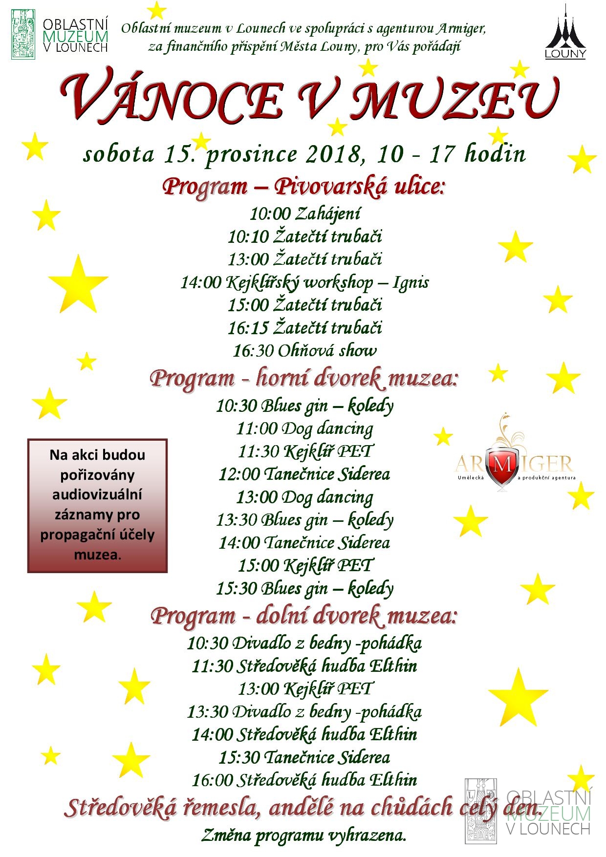 Muzeum společně s městem Louny vás zvou na adventní trhy, které budou zahájeny v 10 hodin před budovou muzea. Těšit se na Vás budou andělé na chůdách, kejklíř, kovář i oslík s ovečkou. Náladu Vám zpříjemní středověká hudba, vystoupení Dog dancing, Divadlo z Bedny a na závěr ohňová show.V prostorách muzea probíhají ukázky různých řemesel, výroba a prodej drobných dárků. Dobré jídlo a pití zajištěno.