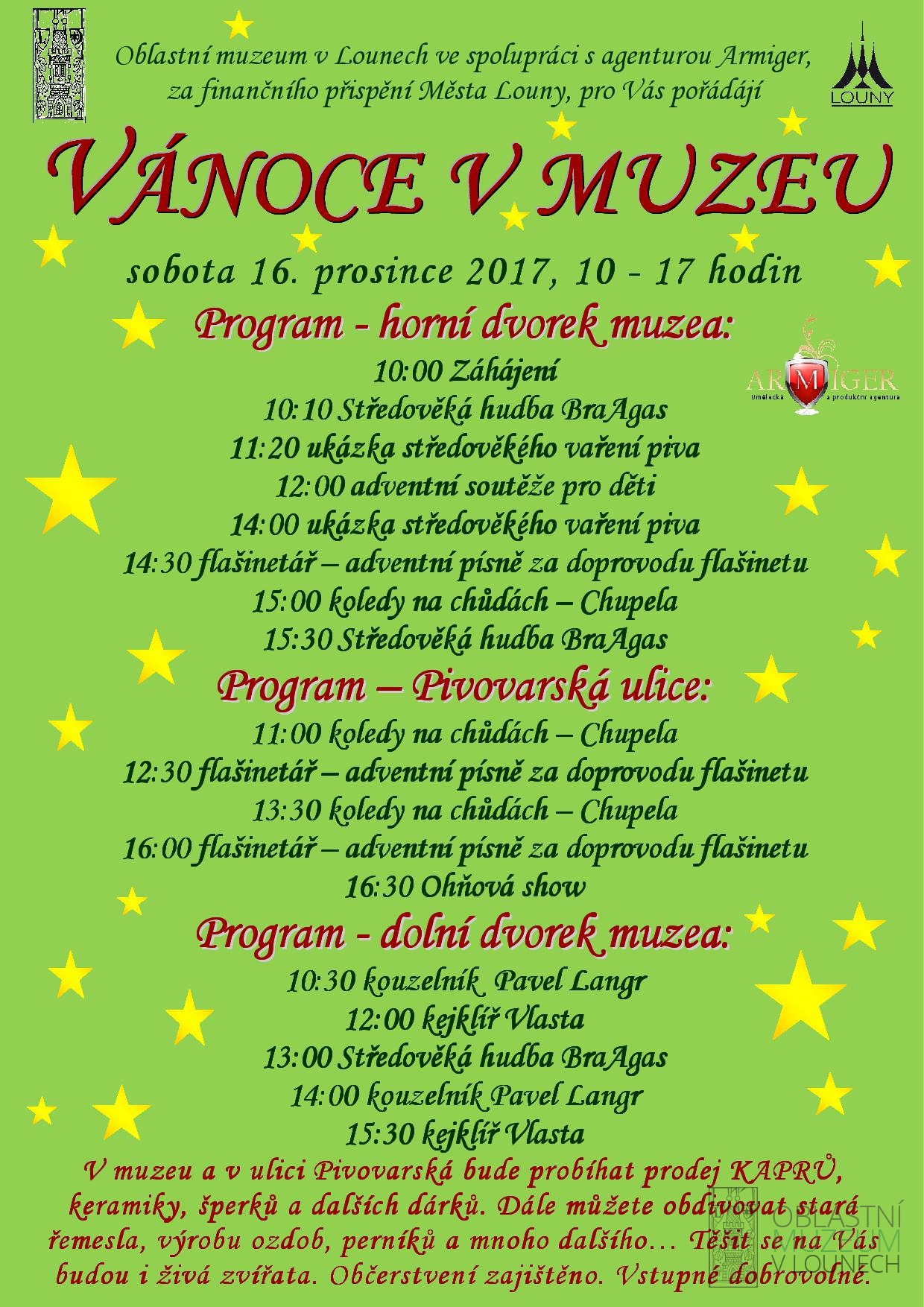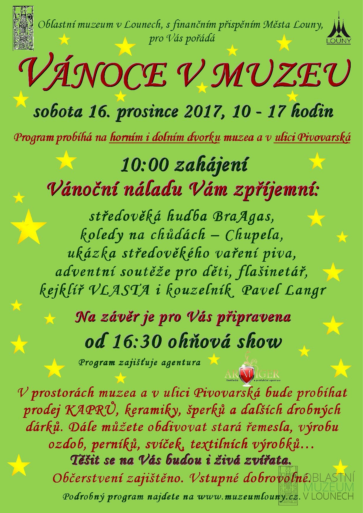 Muzeum společně s městem Louny vás zvou na adventní trhy, které budou zahájeny v 10 hodin před budovou muzea. Těšit se na Vás budou andělé na chůdách, flašinetář, kouzelník, kovář i oslík s ovečkou. V prostorách muzea probíhají ukázky různých řemesel prodej KAPRŮ a dárků. Dobré jídlo a pití zajištěno. Vstupné dobrovolné.