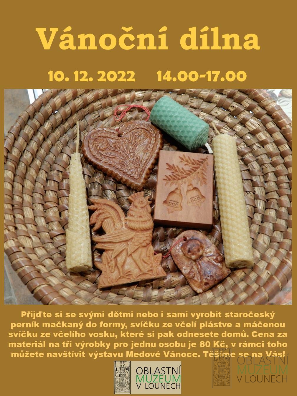 Již tuto sobotu si přijďte od 14 do 17 hod. se svými dětmi nebo i sami vyrobit staročeský perník mačkaný do fromy, svíčku ze včelí plástve a máčenou svíčku ze včelího vosku, které si pak odnesete domů. Přibližný čas na výrobu všech tří věcí je zhruba hodina, ale záleží na Vaší zručnosti. Cena za materiál na tři výrobky pro jednu osobu je 80 Kč, v rámci toho můžete navštívit výstavu Medové Vánoce. Těšíme se na Vás!
