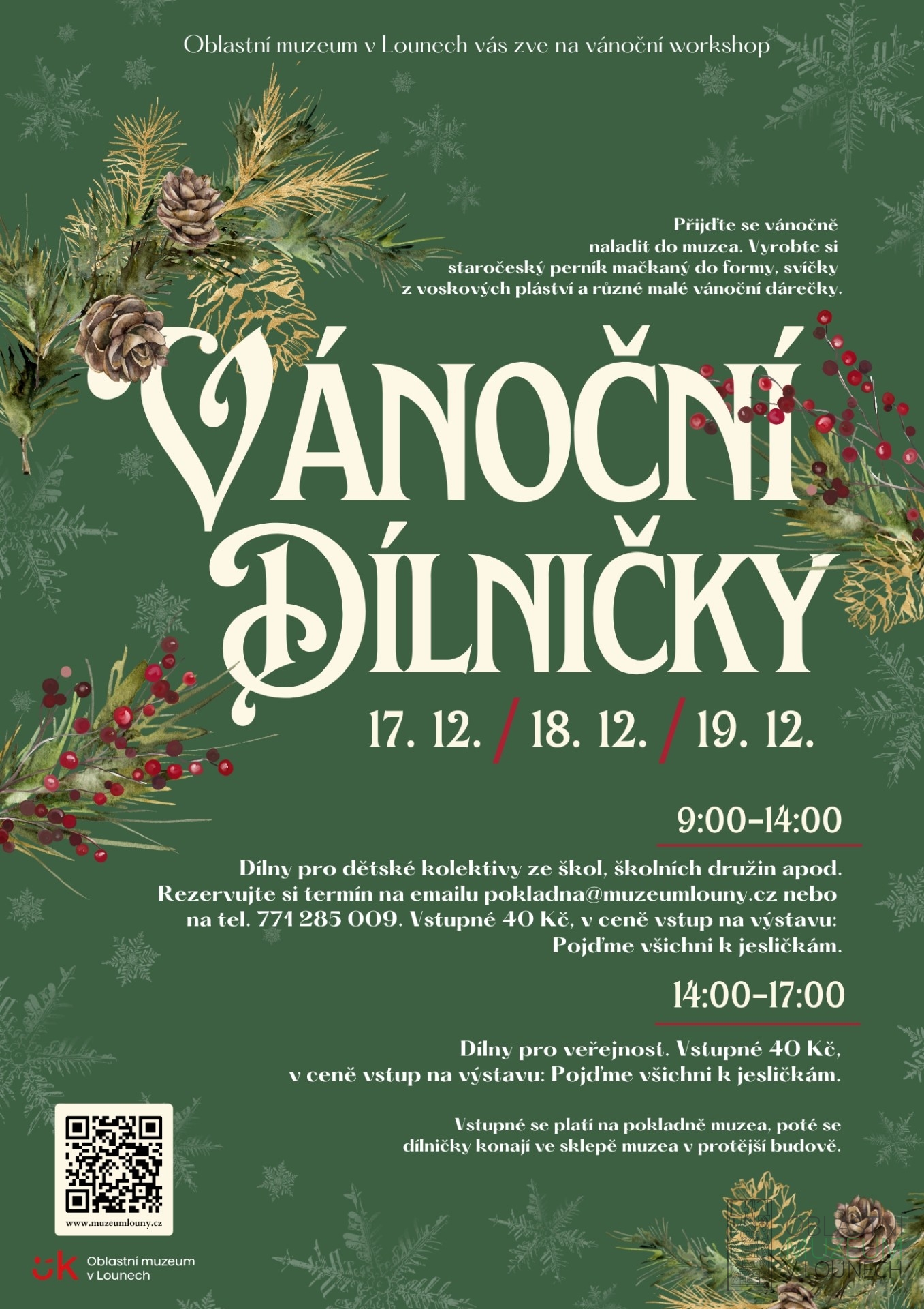 Dílny pro dětské kolektivy ze škol, školních družin apod. Rezervujte si termín na emailu pokladna@muzeumlouny.cz nebo na tel. 771 285 009. Vstupné 40 Kč, v ceně vstup na výstavu: Pojďme všichni k jesličkám.