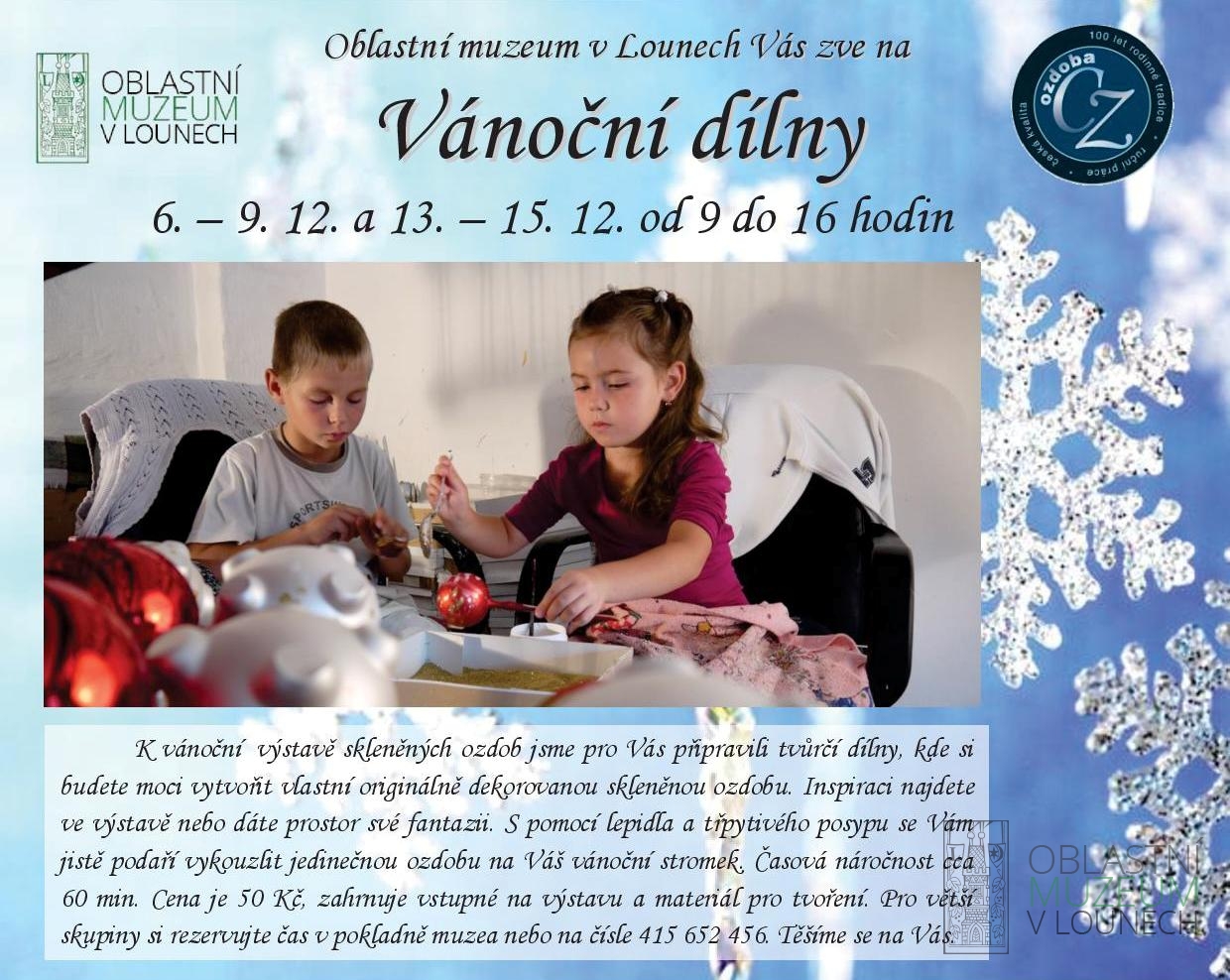 K vánoční výstavě skleněných ozdob jsme pro Vás připravili tvůrčí dílny, kde si budete moci vytvořit vlastní originálně dekorovanou skleněnou ozdobu. Inspiraci najdete ve výstavě nebo dáte prostor své fantazii. S pomocí lepidla a třpytivého posypu se Vám jistě podaří vykouzlit jedinečnou ozdobu na Váš vánoční stromek. Časová náročnost cca 60 min. Cena je 50 Kč, zahrnuje vstupné na výstavu a materiál pro tvoření. Pro větší skupiny si rezervujte čas v pokladně muzea nebo na čísle 415 652 456. Těšíme se na Vás