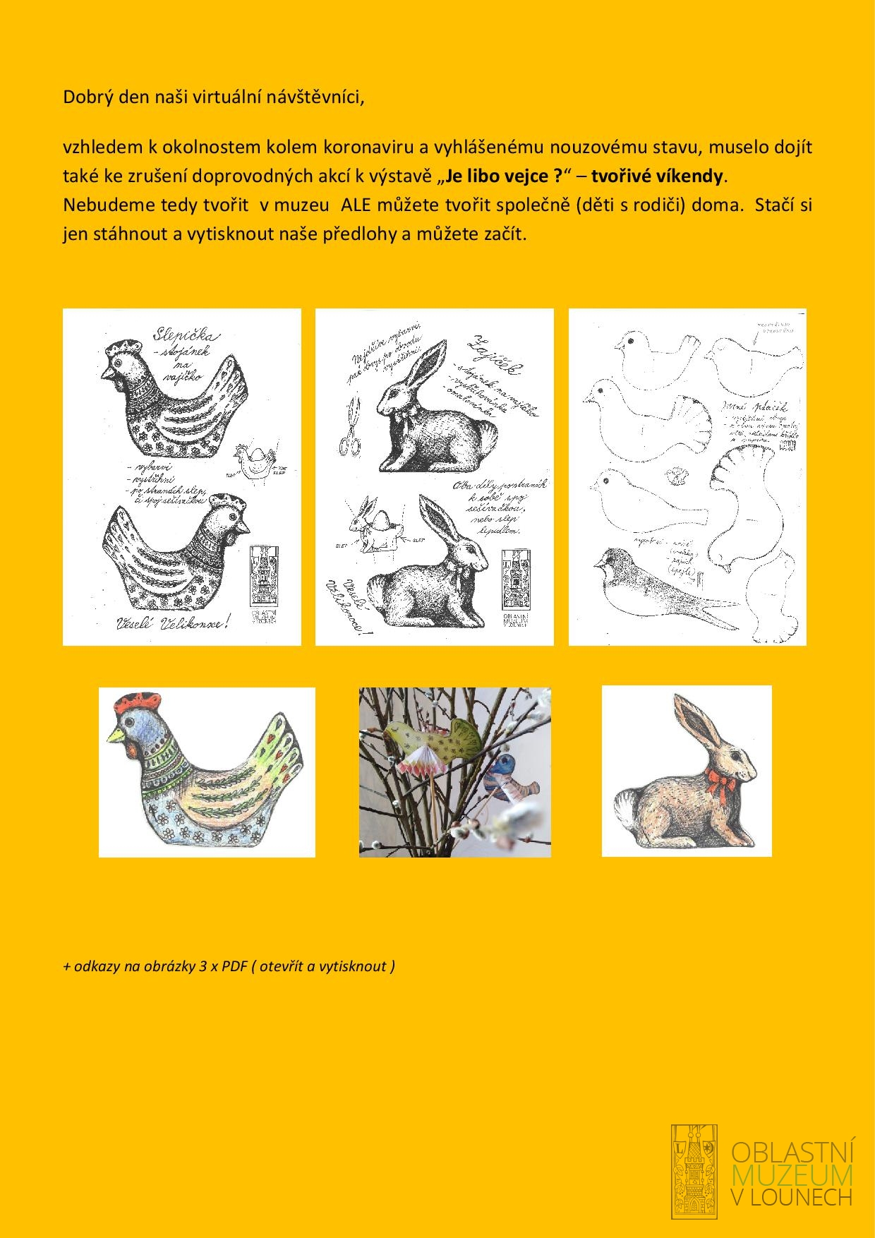 vzhledem k okolnostem kolem koronaviru a vyhlášenému nouzovému stavu, muselo dojít také ke zrušení doprovodných akcí k výstavě „Je libo vejce ?“ – tvořivé víkendy.