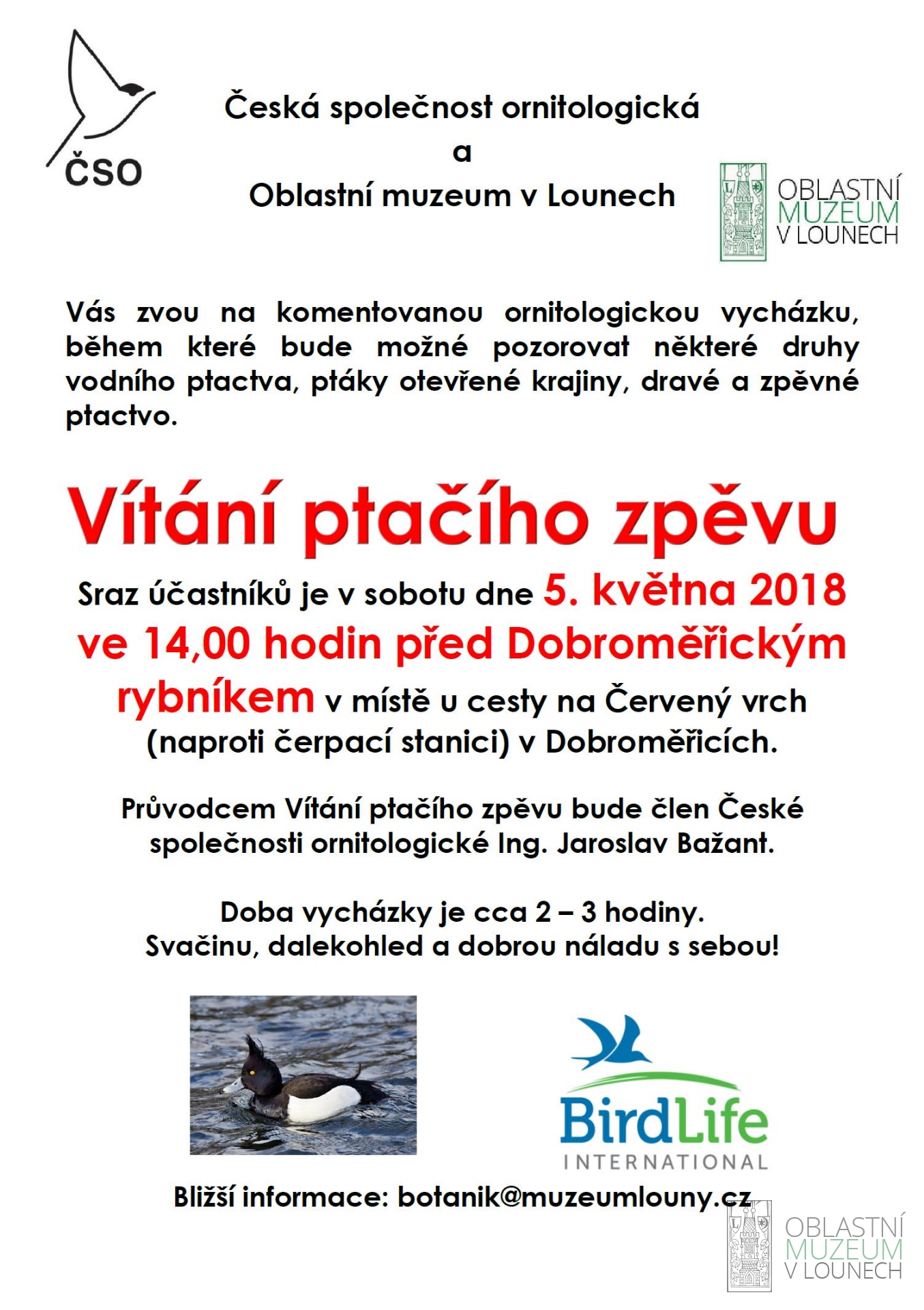 V sobotu 5. května 2018 se uskuteční v rámci celostátní akce Vítání ptačího zpěvu komentovaná ornitologická vycházka s pozorováním vodního ptactva, ptáků otevřené krajiny, dravců a zpěvného ptactva. Sraz účastníků je ve 14,00 hodin před Dobroměřickým rybníkem v místě u cesty na Červený vrch (naproti čerpací stanici) v Dobroměřicích. Průvodcem na akci je člen České společnosti ornitologické Ing. Jaroslav Bažant. Doba vycházky cca 2 – 3 hodiny.