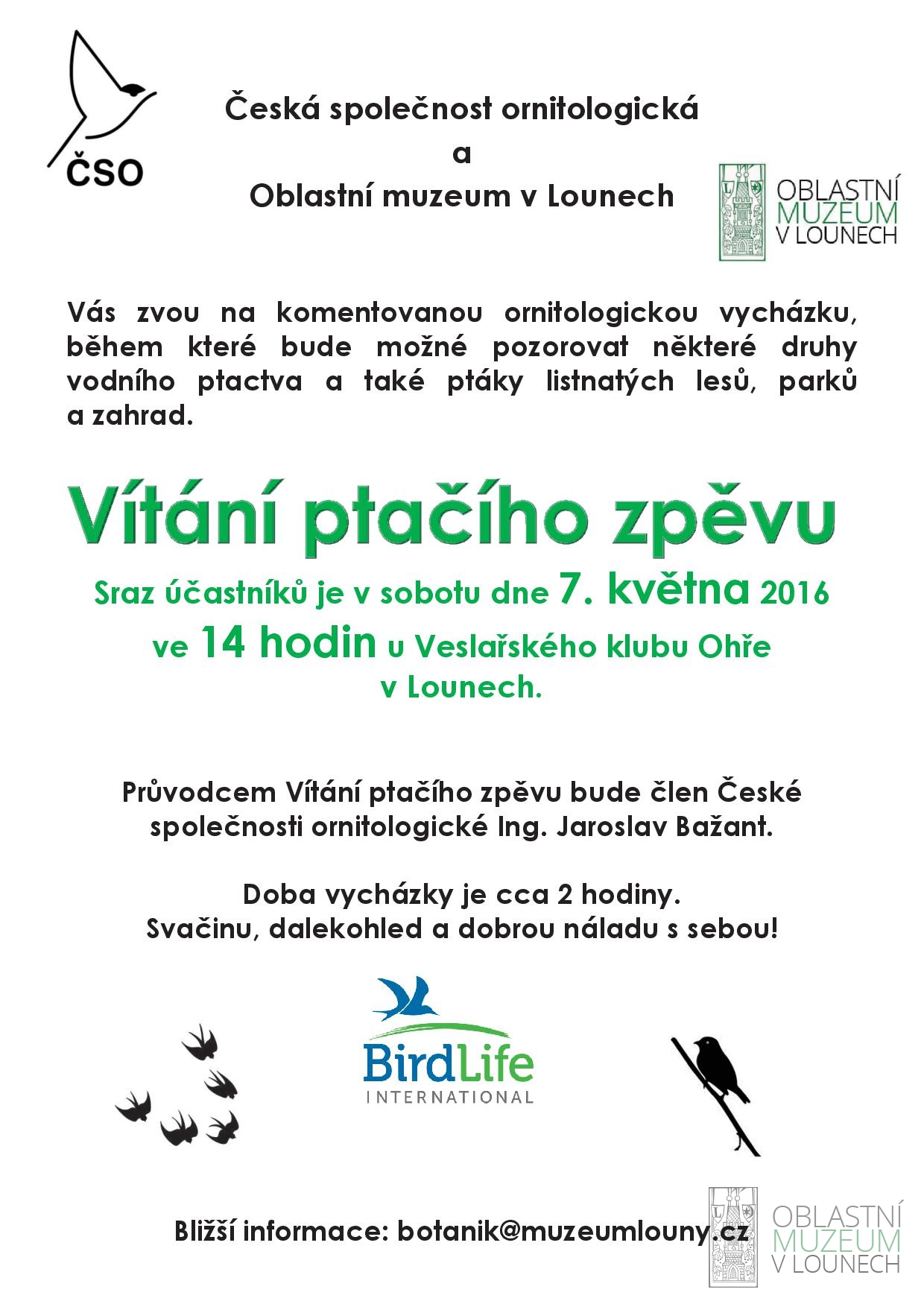 Na komentované ornitologické vycházce se můžete seznámit s některými druhy vodního ptactva a také s ptáky listnatých lesů, parků a zahrad. Průvodcem bude Ing. Jaroslav Bažant – člen České společnosti ornitologické. Sraz účastníků je ve 14.00 hodin u Veslařského klubu Ohře v Lounech. Doba vycházky je cca 2 hodiny. Doporučujeme vzít s sebou dalekohled. Bližší informace: botanik@muzeumlouny.cz