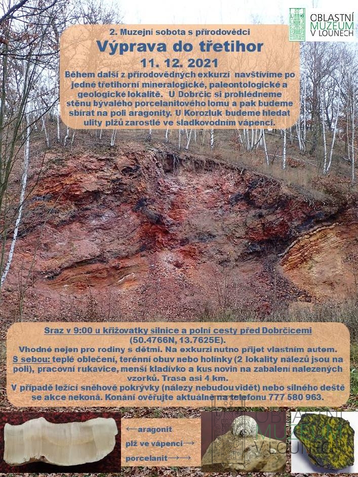 Během další Muzejní soboty s přírodovědci navštívíme v sobotu 11. 12. po jedné třetihorní mineralogické, paleontologické a geologické lokalitě. U Dobrčic si prohlédneme stěnu bývalého porcelanitového lomu a pak budeme sbírat na poli aragonity. U Korozluk budeme hledat ulity plžů zarostlé ve sladkovodním vápenci. Vhodné nejen pro rodiny s dětmi. Na exkurzi nutno přijet vlastním autem, které bude třeba na kratší přesuny. Sraz v 9:00 u křižovatky silnice a polní cesty před Dobrčicemi (50.4766N, 13.7625E). S sebou: teplé oblečení, terénní obuv nebo holínky (2 lokality nálezů jsou na poli), pracovní rukavice, menší kladívko a kus novin na zabalení nalezených vzorků. Trasa asi 4 km. V případě ležící sněhové pokrývky (nálezy nebudou vidět) nebo silného deště se akce nekoná. Konání ověřujte aktuálně na telefonu 777 580 963.