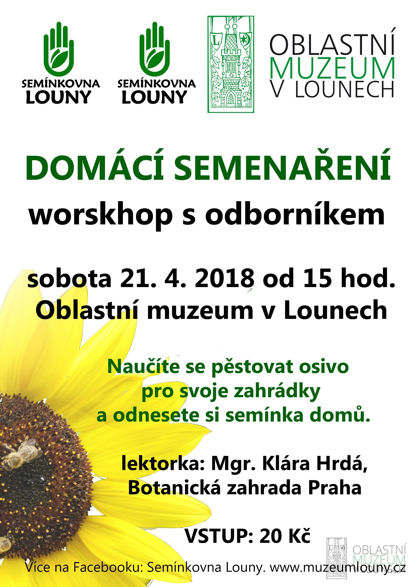 V sobotu 21. dubna přijede do Loun botanička a zakladatelka iniciativy Semínkovny Mgr. Klára Hrdá a povede v muzeu odpolední workshop DOMÁCÍ SEMENAŘENÍ, kde vás naučí pěstovat si semínka pro potřebu svých zahrádek. Nenechte si tuto akci ujít, letos už se v Lounech nebude opakovat! Jsme nadšení, že Klára přijala naše pozvání a přijede, účastníkům kurzu doveze i vlastní semínka!