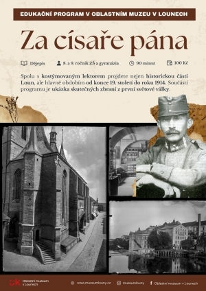 Spolu s kostýmovaným lektorem projdete nejen historickou částí Loun, ale hlavně obdobím od konce 19. století do roku 1914. Součástí programu je ukázka skutečných zbraní z první světové války.
