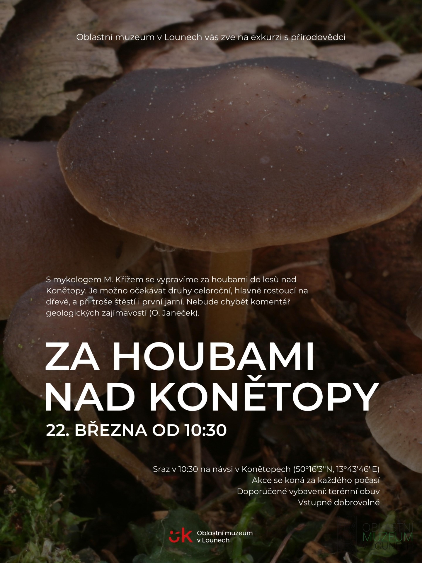 S mykologem M. Křížem se vypravíme za houbami do lesů nad Konětopy. Je možno očekávat druhy celoroční, hlavně rostoucí na dřevě, a při troše štěstí i první jarní. Nebude chybět komentář geologických zajímavostí (O. Janeček). Sraz v 10:30 na návsi v Konětopech (50°16'3"N, 13°43'46"E). Akce se koná za každého počasí. Doporučené vybavení: terénní obuv. Vstupné dobrovolné.