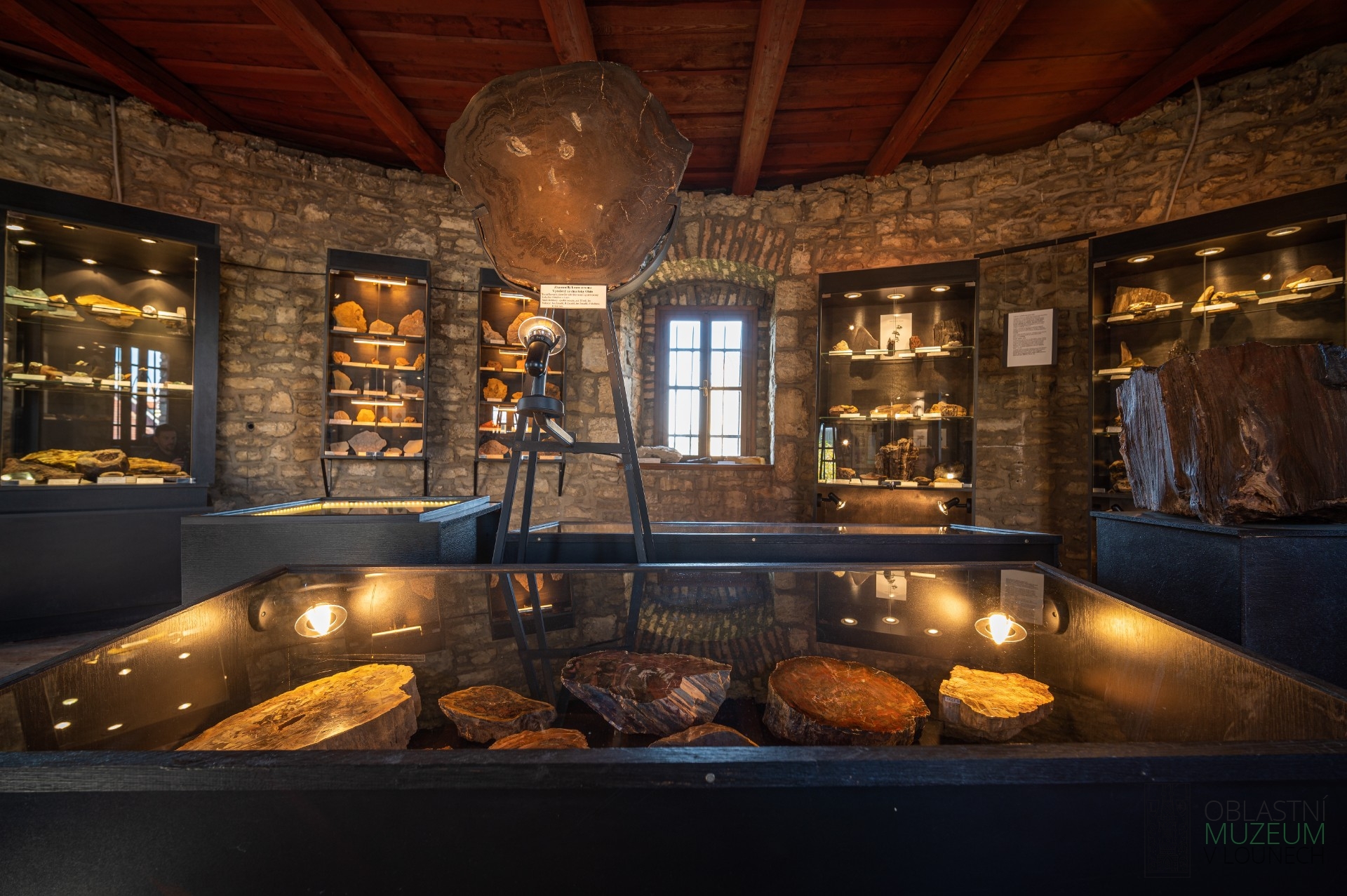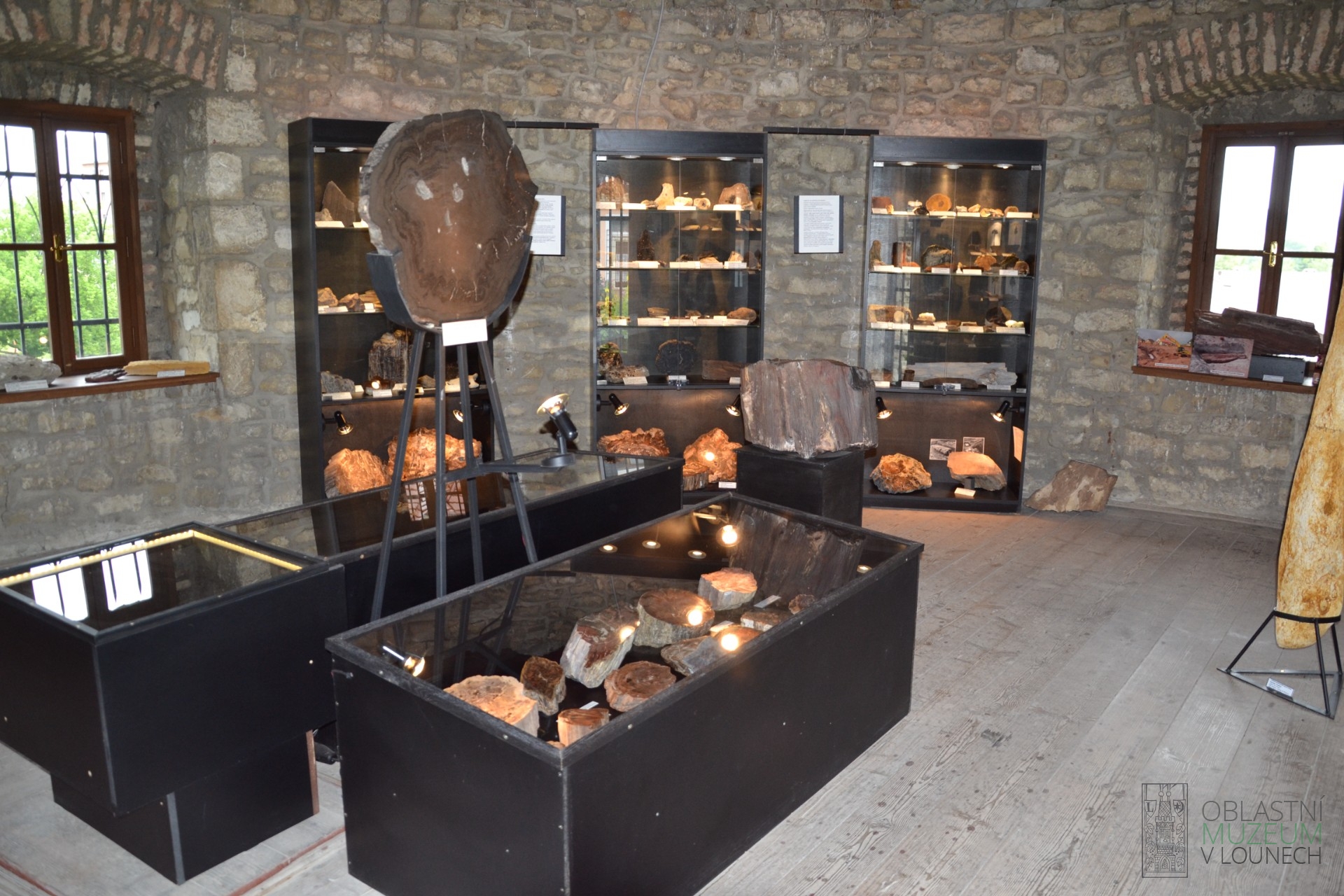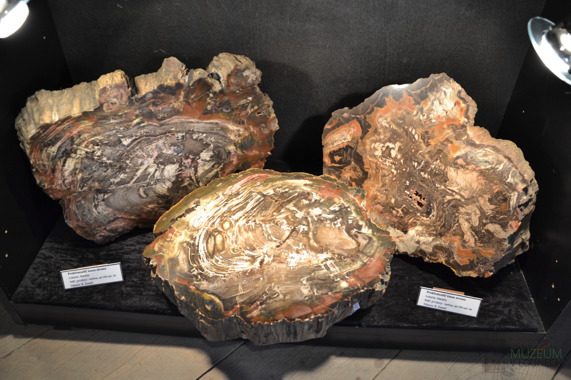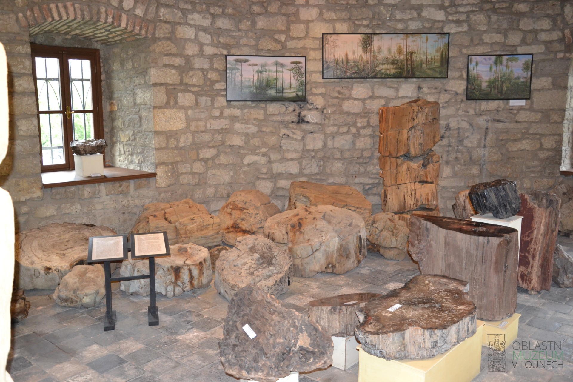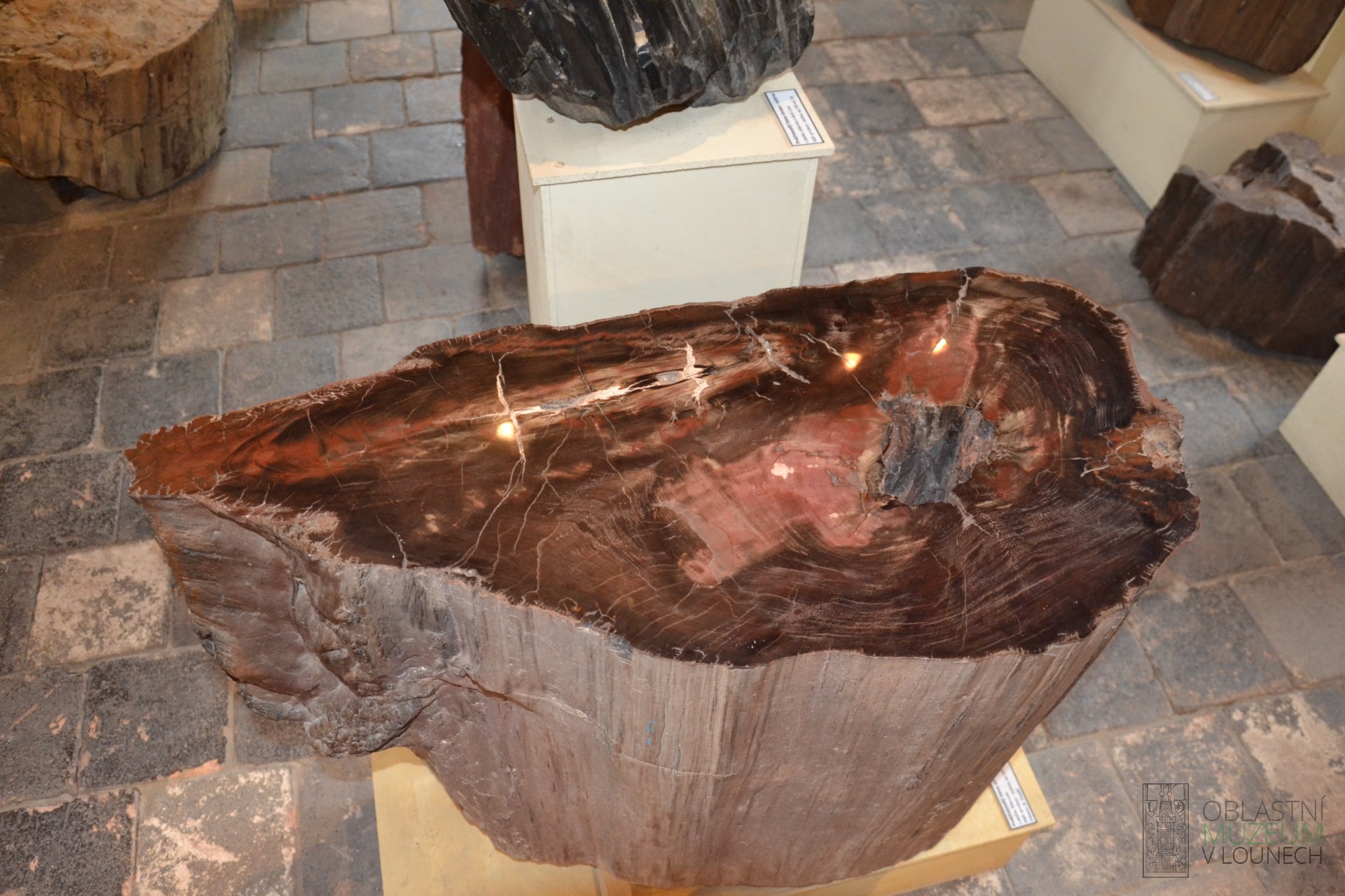 Vystaveno je zde přes 400 vzorků zkamenělých dřev, větví a kořenů starých až 350 milionů let, zčásti v přírodním stavu, zčásti naleštěných. Nechybí unikáty jako otisky listů, zkamenělé šišky, dřeva provrtaná dřevokazným hmyzem, fosilní pryskyřice, krystaly minerálů v dutinách kmenů. Nejzajímavějším exponátem je velký kmen prokřemenělého třetihorního kmene kaštanovníku z pískovny ve Velké Černoci, se zachovalou hnízdní dutinou s vletovými otvory datla. Z Mradic pocházejí kusy rozlámaného, velkého, třetihorního, kalcifikovaného kmene vytažené přímo z koryta Ohře.