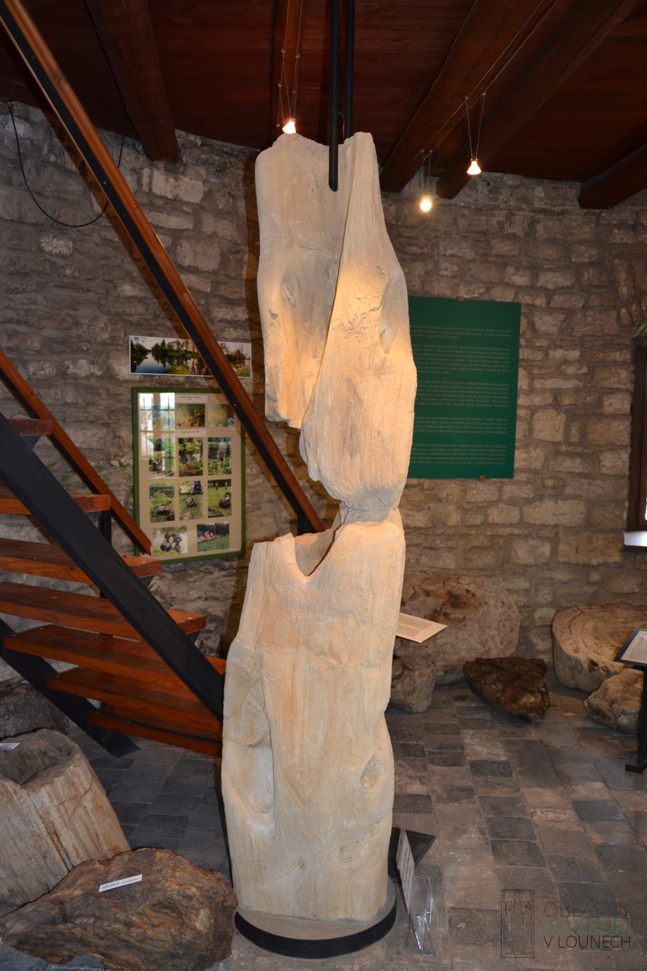 Nejzajímavější vzorek expozice – prokřemenělé dřevo třetihorního kaštanovníku z pískovny ve Velké Černoci, se zachovalou hnízdní dutinou datla